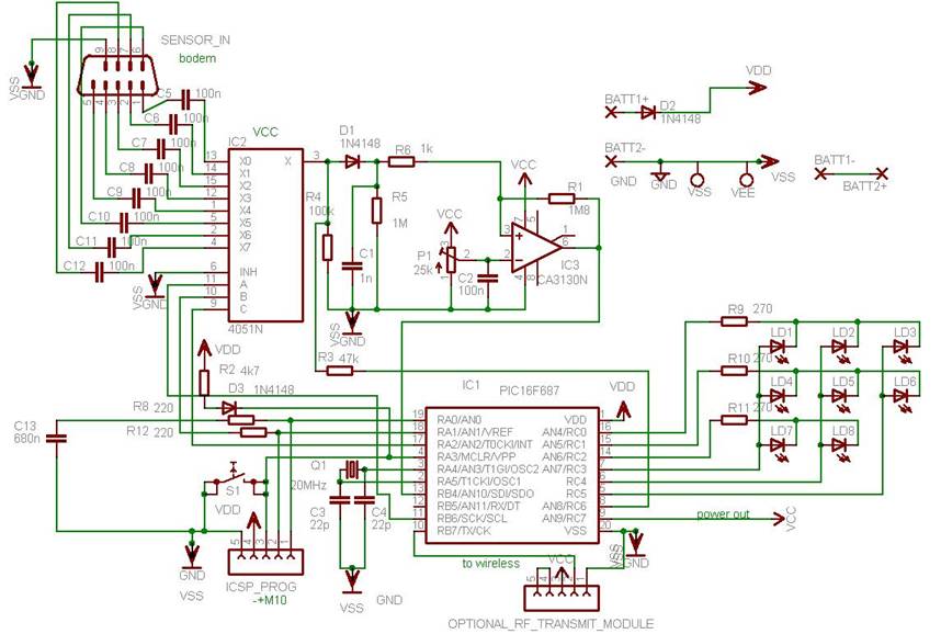 De microcontroller (IC1) fungeert als centraal stuurelement van de schakeling. Poort RC6 (uitgang) is een softwarematige oscillator van ca. 10 kHz. Deze uitgang vormt de meetspanning, die terecht komt op de spanningsdeler R3/R4. Via de-multiplexer IC2 en condensatoren C5..C12 komt de meetspanning tevens op de via de X1 sub-d connector aangesloten elektroden. Dit komt doordat de de-multiplexer aangestuurd wordt door een BCD waarde (0..7) die door de microcontroller geleverd wordt via <RB6:RA1:RA2>, waardoor dus de elektroden beurtelings worden afgetast.