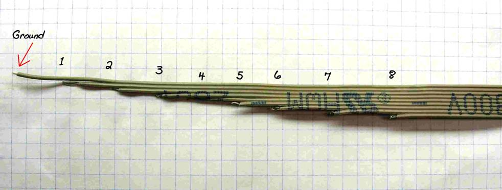 Het maken van een geschikte sensor is heel eenvoudig. Neem wat lintkabel van 9 geleiders en knip elke geleider op de gewenste lengte af. De massa moet het langst zijn want deze komt helemaal op de bodem van het te meten vat, of toch minstens onder de draad van de onderste sensor. Strip alle 9 uiteinden ook een halve centimeter af. De lintkabel vervolgens in een stuk PVC buis steken en vastmaken.