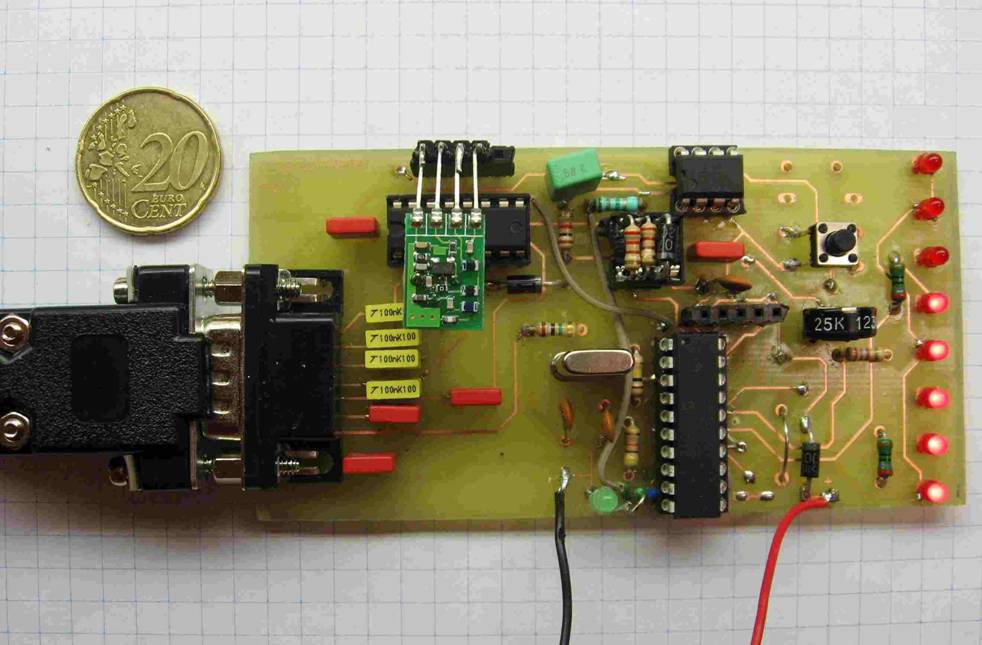 De gemeten waarde wordt via leds LD1..LD8, die gemultiplexed vanuit de microcontroller aangestuurd worden, keurig getoond.