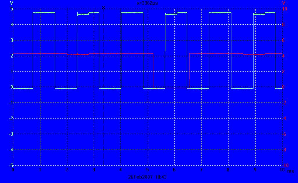 Onderstaande foto geeft weer wat men kan verwachten als men met een 2-kanaals oscilloscoop de signalen RB6 (pin 11 van de PIC) en opamp-out (pin 6 van de CA3130) vergelijkt. Het groene signaal is dat van RB6, het rode signaal is dat van de CA3130 waarbij de onderste twee elektroden onder water staan. De scaling van de scope is aangepast op respectievelijk 5V en 10V om de signalen beter van mekaar te kunnen onderscheiden. De tijdinstelling staat op 1 ms/div.