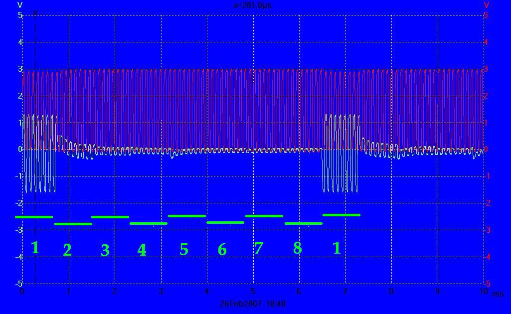 Hoe meer sensor draden er onder water staan, hoe breder de nul-tijd van het rode signaal. In onderstaand voorbeeld is de breedte van het 0-tijd van het rode signaal dus ongeveer twee groene pulsen (een groene 0 en een groene 1). Zoals eerder reeds aangegeven blijft de 0 van het rode signaal iets langer duren dan verwacht (dit is normaal) en gaat hij dan weer omhoog.