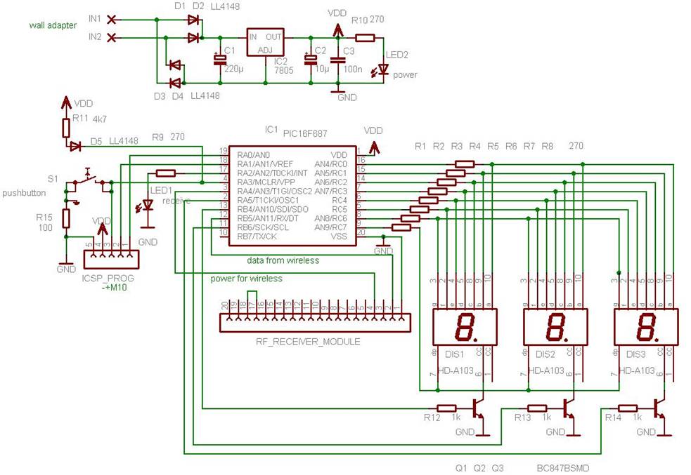De receiver module bevat eveneens een PIC16F687 microcontroller als centraal element. Daarnaast zijn er nog drie 7-segment displays. Dit is een beetje overkill, want aan één display hebben we in principe genoeg (de gemeten waarde is van 0 tot en met 8). In de toekomst ben ik van plan om deze receiver-module nog voor andere projecten in te zetten zoals bijvoorbeeld een draadloze wind snelheidsmeter enz., vandaar dus 3 displays.