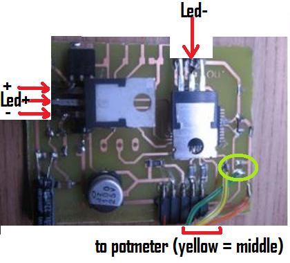 strip – en +). Indien gewenst, soldeer een potmeter aan de groene, gele en